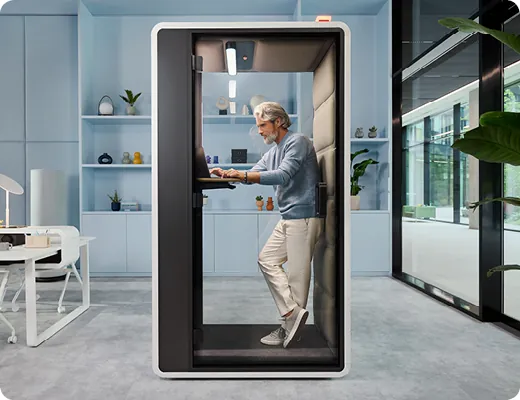 HushFree.S – an acoustic booth for solo work, phone and video calls. Equipped with a movable sit-and-stand tabletop, you can choose how you want to work. It also features additional side LED lighting.