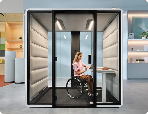 HushFree.Access.M – an acoustic pod adapted to the needs of people with mobility disabilities. It can accommodate meetings for up to four people or serve as a private office.