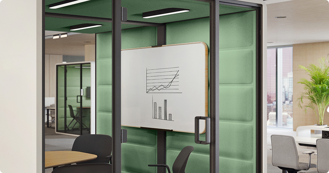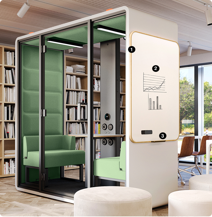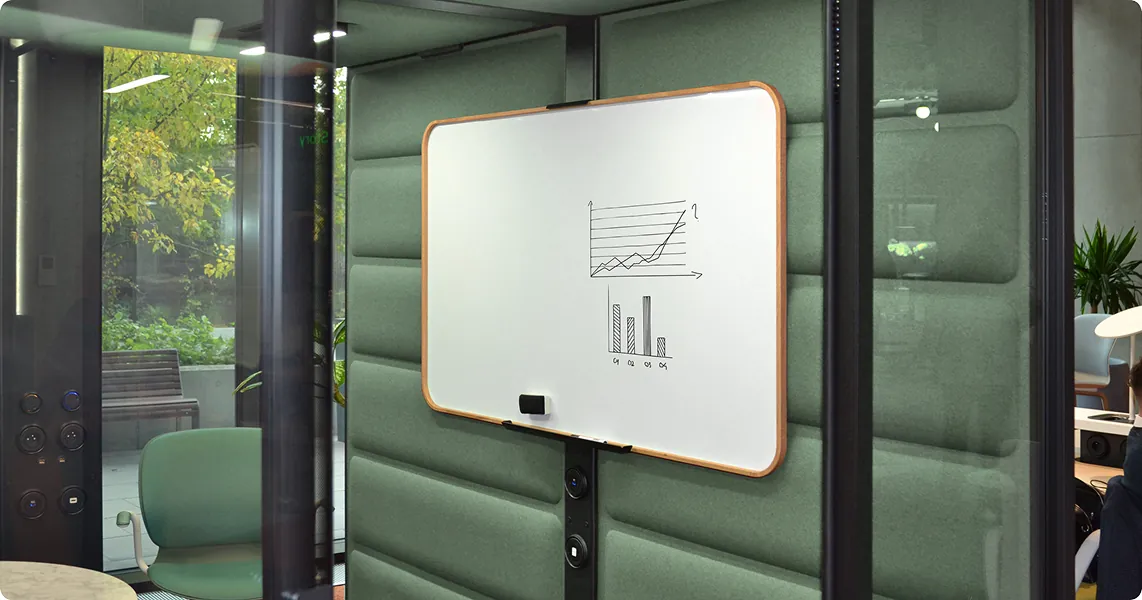 Internal magnetic whiteboard is designed for the hushFree.L and hushFree.Access.L meeting pods. It makes it even easier to share information and write down your ideas during a conversation.