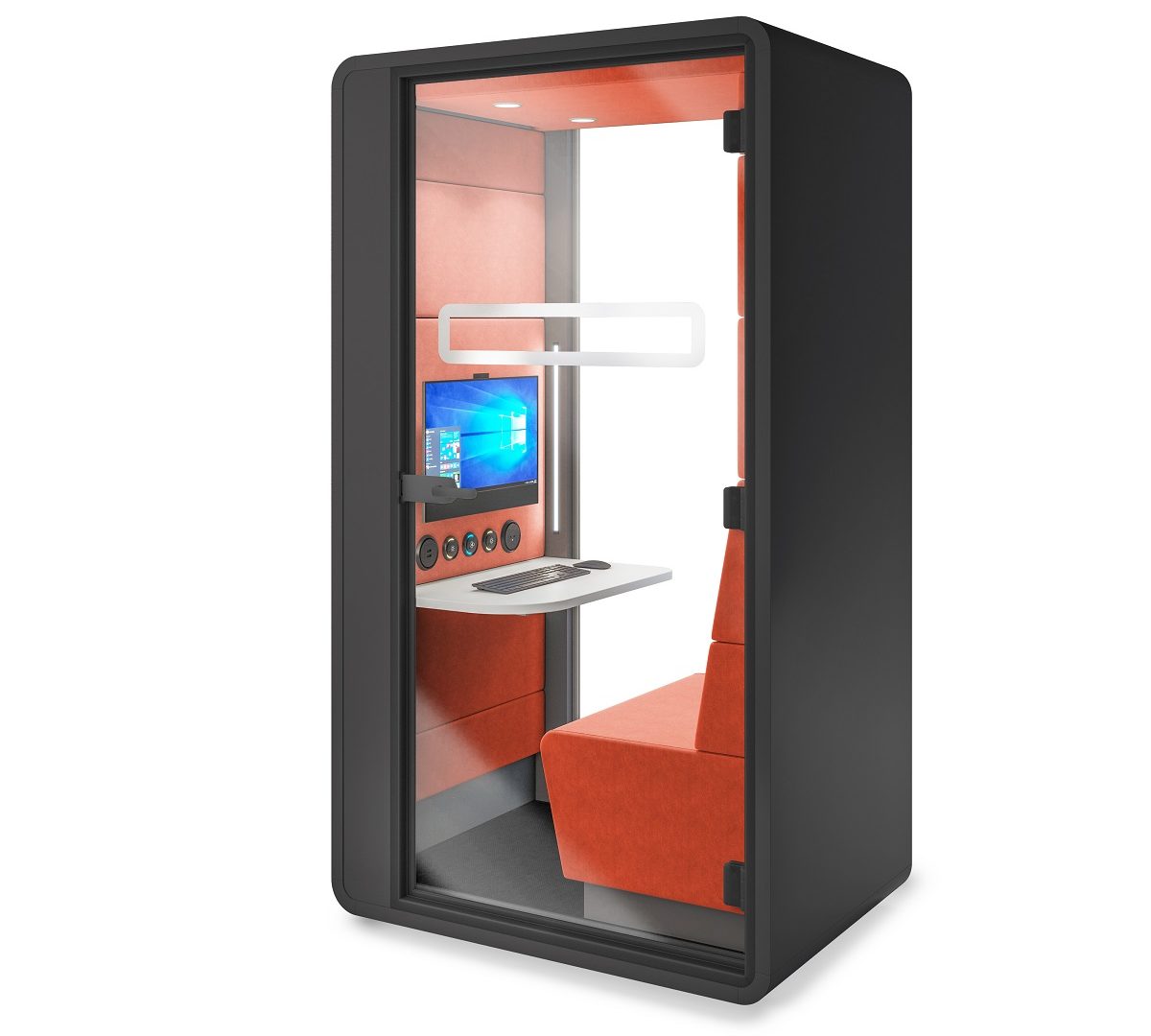 First, the pod traps the user’s noise and provides the perfect acoustic environment for their video call. Second, the pod acts as a sound dampener for the open space, as its tempered glass panels insulate sound. So noise is trapped on the inside, dampened on the outside, reduced overall. The whole team benefits. Everyone enjoys better acoustics and better calls, whether in the pod, on the open floor, or jumping on the call from home.