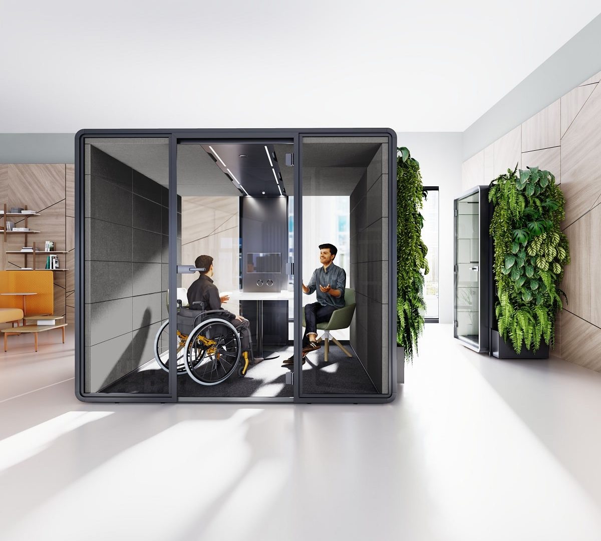 HushAccess.L to budka akustyczna do biura, dostosowana do potrzeb osób z niepełnosprawnością ruchową