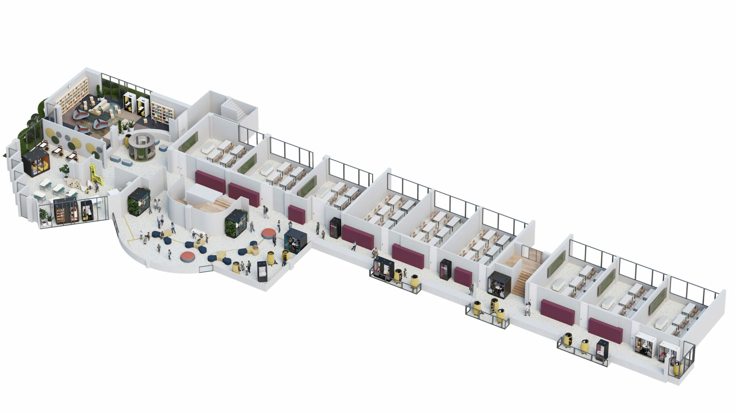 Kabiny akustyczne Hushoffice zajmują stosunkowo mało powierzchni, gwarantując przestronną przestrzeń wewnątrz. Można je ulokować np. w korytarzu lub innych już obecnych pomieszczeniach, aby zmaksymalizować efektywne wykorzystanie powierzchni placówki.