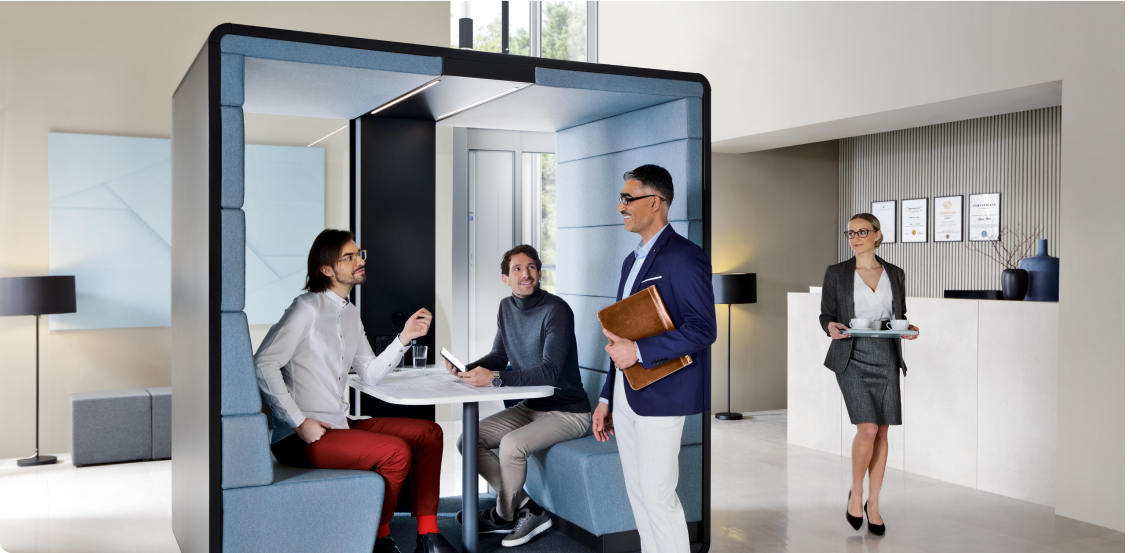 HushPhone, hushWork i częściowo hushMeet oferują boxy w pełnej obudowie (room-in-room) dające maksimum prywatności i skupienia w trakcie rozmowy telefonicznej, spotkań lub pracy indywidualnej.